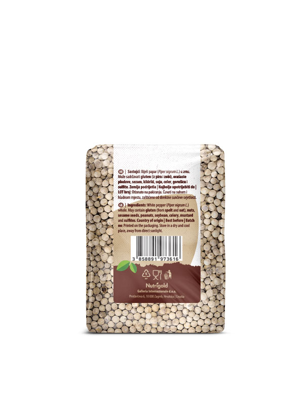Nutrigold beli poper dobimo z obiranjem zrelih jagod, čemur sledi postopek sušenja zrn. Na koncu se odstrani lupina. Ta način spravila in predelave je odgovoren za značilno belo barvo in nežnejšo aromo v primerjavi s črnim poprom.