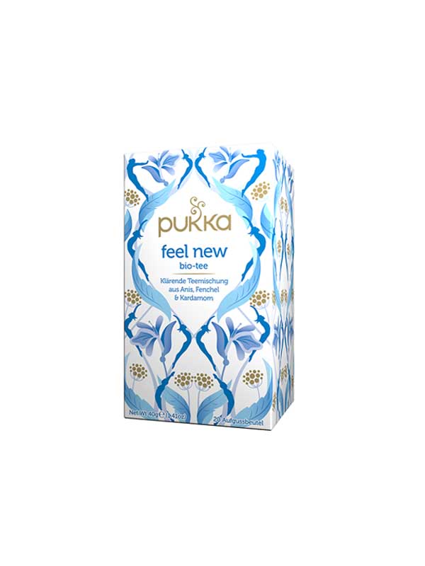 Mešanico čaja Pukka Feel New so ustvarili strokovnjaki za zelišča in strokovnjaki za prehrano ter združili najnovejše znanstvene raziskave s tradicionalno zeliščno modrostjo za naravno podporo vašemu telesu in duhu.