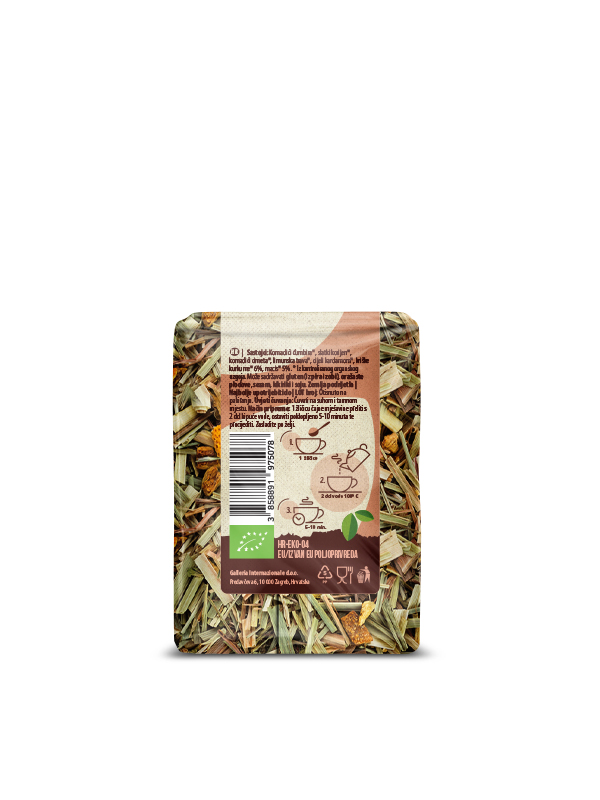 Koščki ingverja *, sladki koren *, koščki cimeta *, limonska trava *, cel kardamom *, rezine kurkume *, macis *