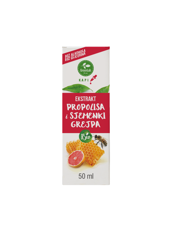 GreenLab izvleček propolisa in semen grenivke je certificirano ekološko prehransko dopolnilo, ki vsebuje antioksidativno moč bioflavanoidov iin grenivkinih semen. Propolis naravno ščiti telo okužb.