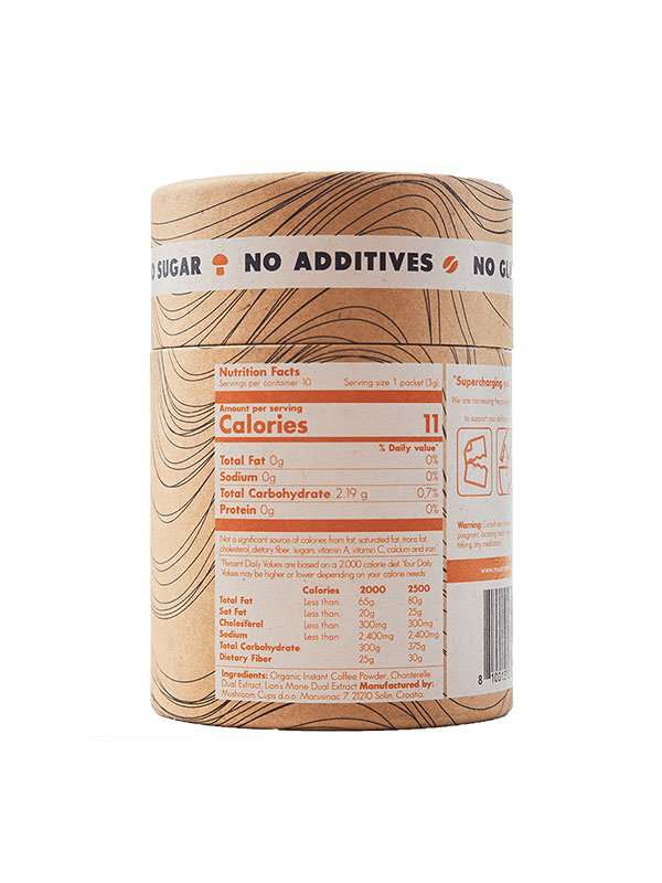 Popoln začetek vsakega dne je v topli skodelici perujske instant kave Mushrooms Cups. Ta okusna ekološko pridelana kava je obogatena z gobami in predstavlja popolno kombinacijo za energičen začetek dneva, pa tudi takrat, ko čez dan potrebujete dodaten "boost".