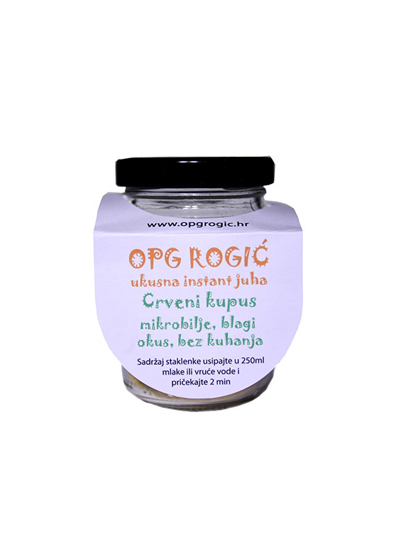 Ta instant juha z rdečim zeljem ponuja bogat, naraven okus, idealen za vse, ki želijo pojesti zdrav obrok. Narejena je iz 100% ekoloških sestavin, vključno s korenčkom, čebulo, krompirjem, zeleno in rdečim zeljem. Popolnoma je naravna, brez dodatkov, barvil, ojačevalcev okusa in konzervansov.