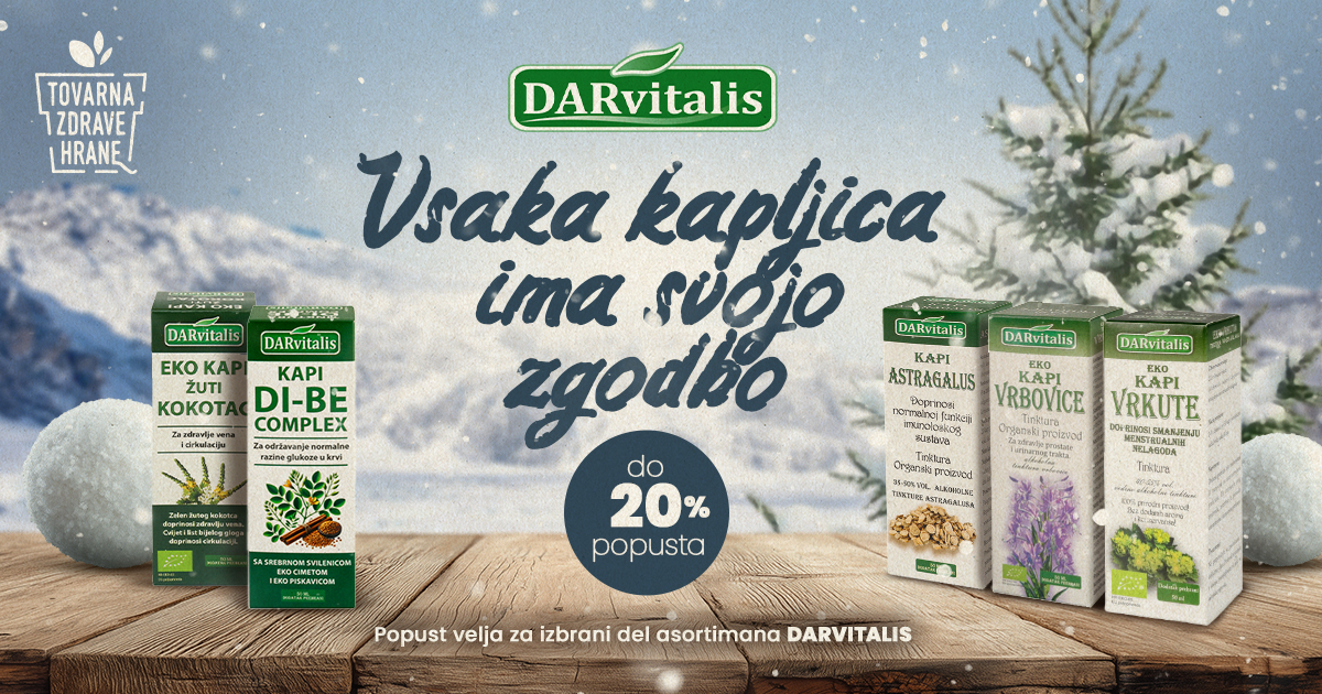 Pohiti, saj akcija traja le do 13. 1. 2026! Izkoristi 20 % popusta na izbrani del ponudbe Darvitalis izdelkov.