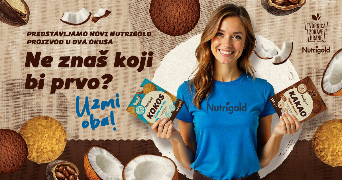 Ko te premami želja po sladkem - med pavzo, na poti ali ob najljubši kavi - so Nutrigold čajni piškoti pametna izbira. Na voljo sta dva neustavljiva okusa, kokos in kakav, brez sladkorja, a s polnim, bogatim okusom, ki bo prepričal tudi najzahtevnejše brbončice. Praktična embalaža vsebuje štiri manjše paketke, ki so kot nalašč za s seboj, za deliti ali prihraniti za kasneje.
