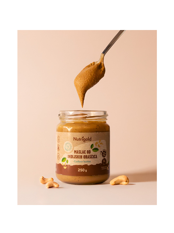 Maslo iz indijskih oreščkov Nutrigold je pridobljeno iz 100% surovih indijskih oreščkov najvišje kakovosti, pretvorjenih v neustavljivo kremast namaz bogatih arom.