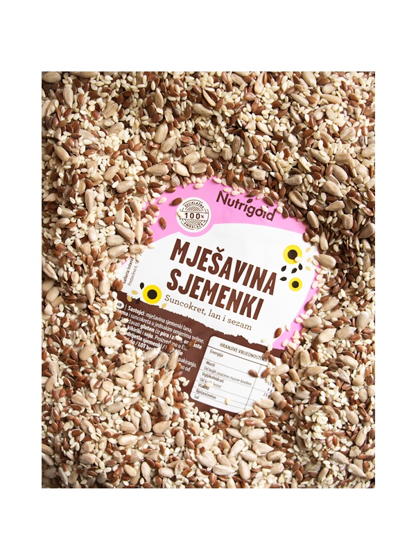Nutrigold mešanica semeni izjemno kakovosti rahlo-oreškastega okusa, pridobljen s skrbno izbranimi semeni sončnic, lana in sezama v enakem razmerju.