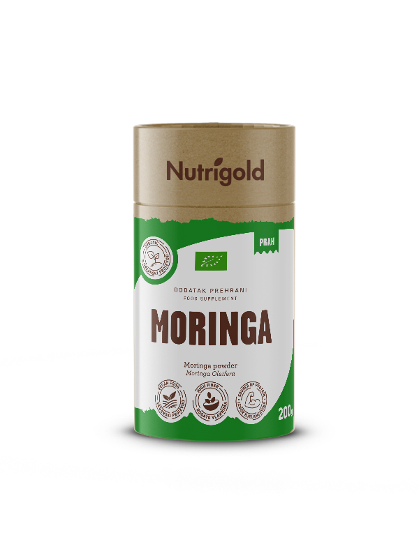 Nutrigold moringa v prahu vsebuje 100% surove moringe v prahu iz ekološki certificirane pridelave. Pridobljena je s sušenjem kakovostnih in skrbno gojenih listov moringe, ki po tem grejo skozi postopek mletja v fini prah.