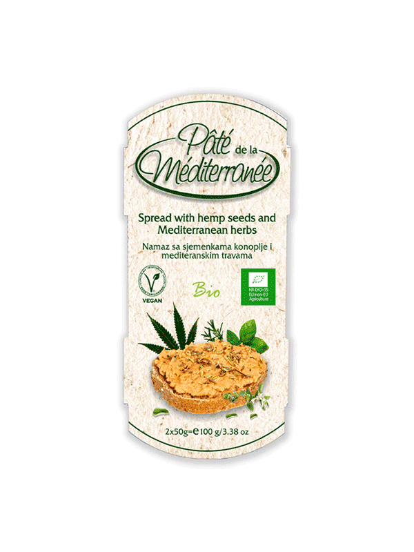 Voda, čičerika * (14 %), sončnično olje *, sušeni paradižniki *, konopljina semena (Cannabis sativa) * (3,5 %), oljčno olje *, sončnične beljakovine *, morska sol, mediteranske rastline* (0,7%) limonin sok *, poper*, gostilo: guar gumi*.