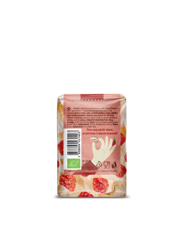 Čips iz kokosa in goji jagode iz kontrolirane ekološke pridelave sta popolna kombinacija okusa slastne brusnice in češnje ter se popolnoma podajo ekološkem čipsu iz kokosa.