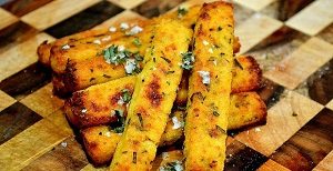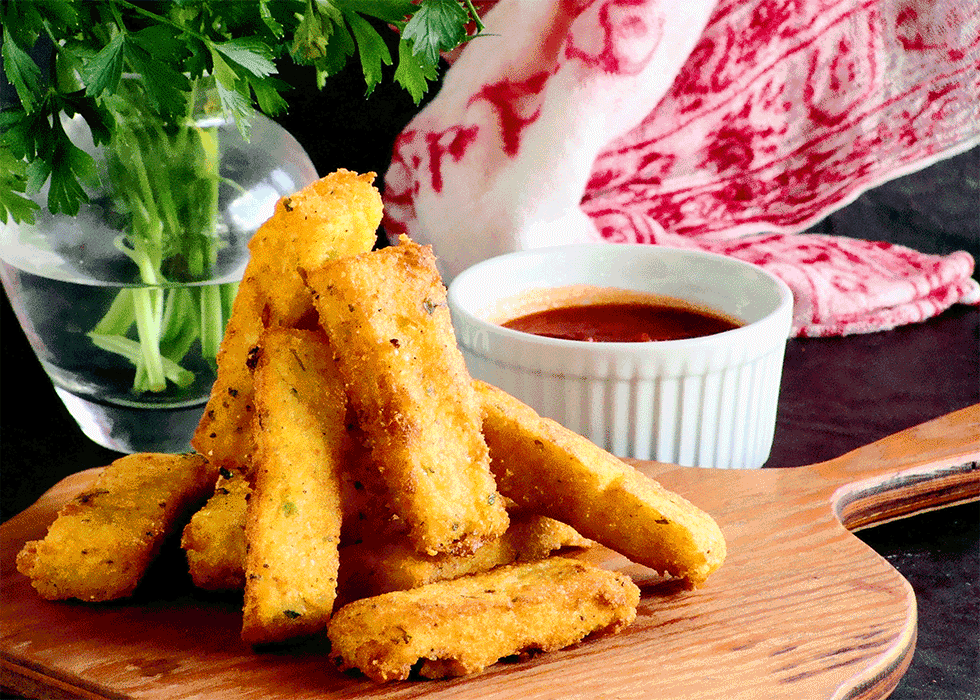 - Ko se polenta ohladi, zrežite na trikotnike ali trakove, premažite z oljčnim oljem in posujte z zeliščem in parmezanom ter vse skupaj zapečite na 250°C okoli 15 minut.