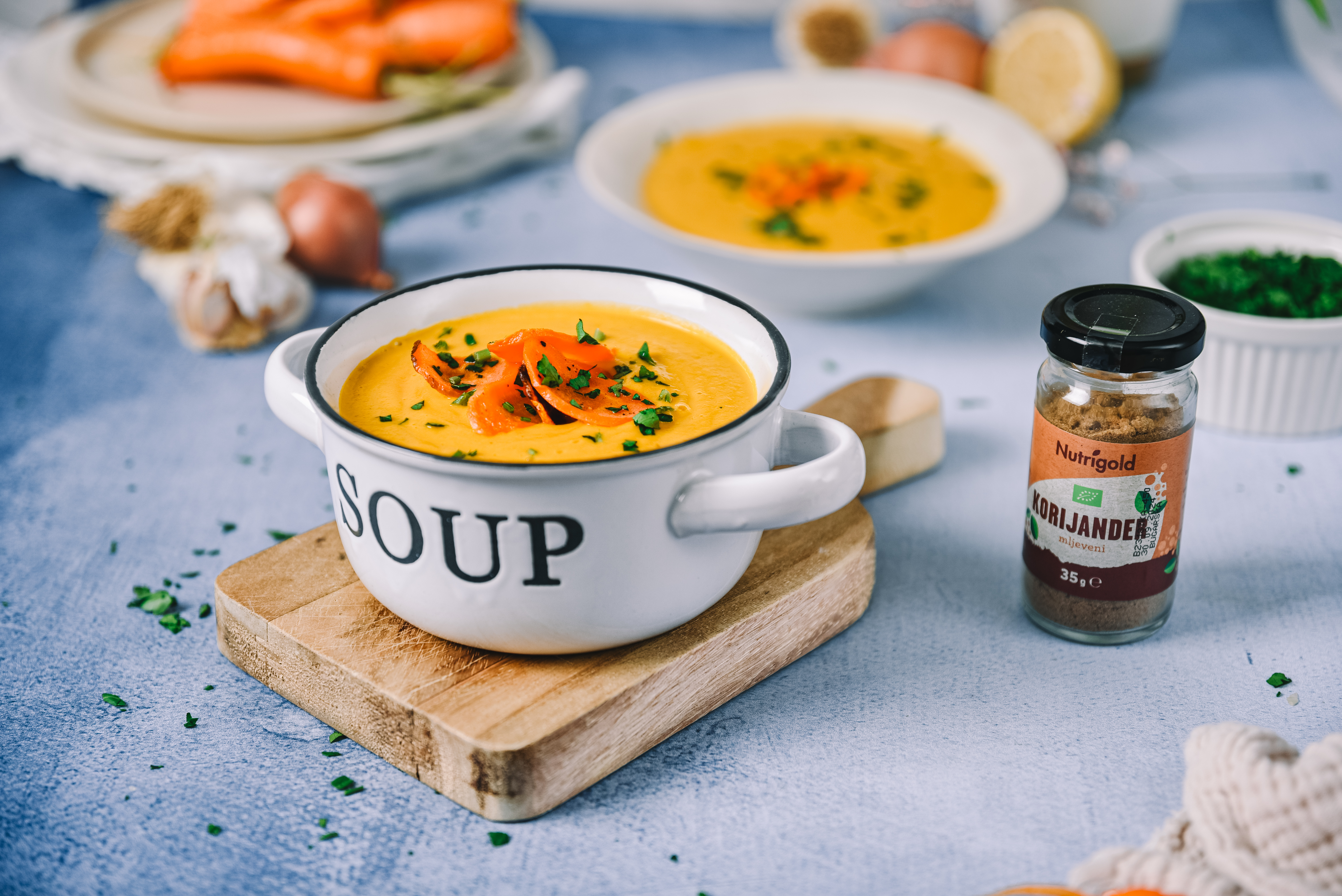 Pečeni korenčki, nežno začinjeni in karamelizirani, dodajajo globok in bogat okus juhi, medtem ko jih spremlja sladkoba juhe in nežnost koriandra. Tekstura juhe je gladka in kremasta, obogatena s svežino zelenjave in bogastvom okusov.