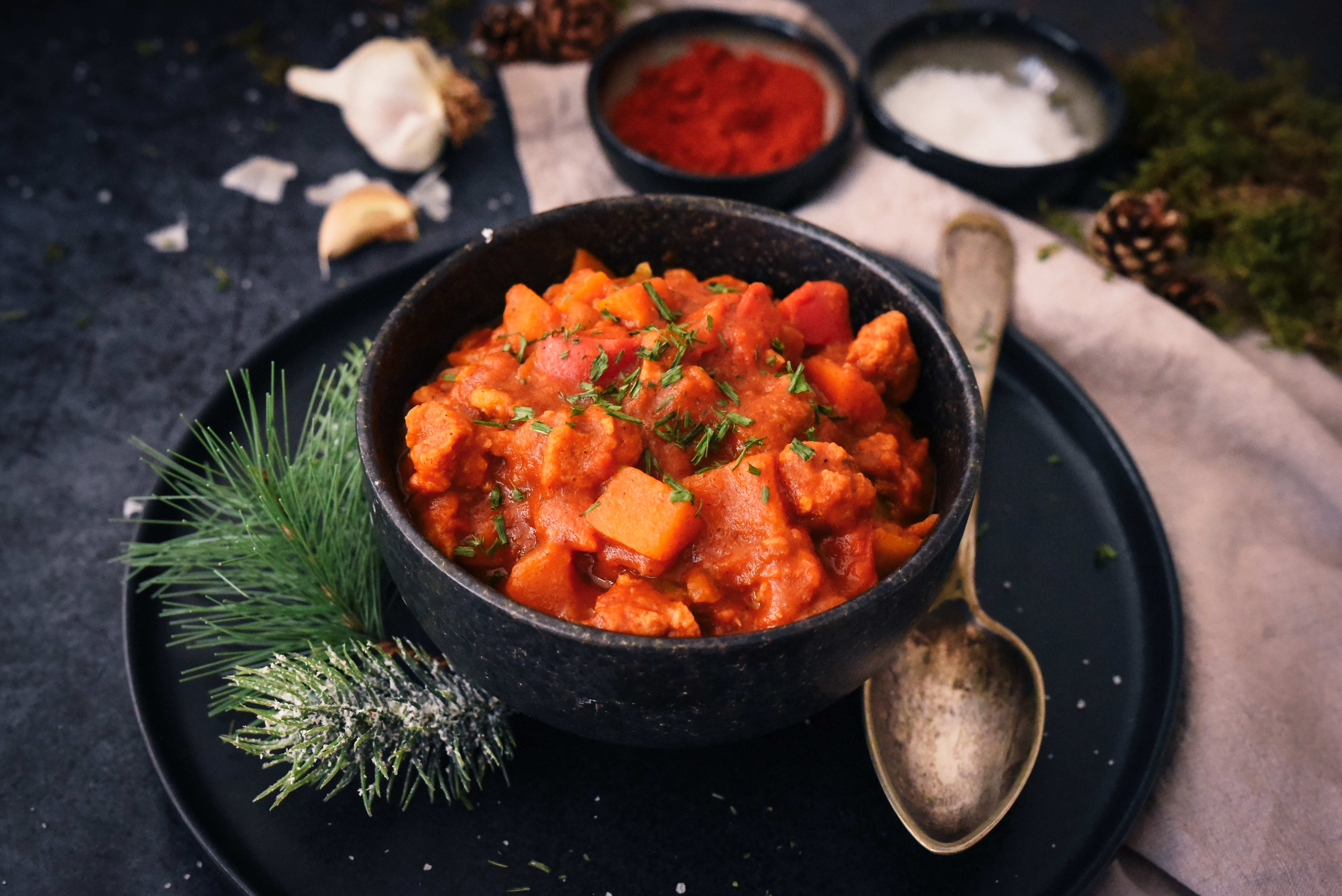 Gulaš je še ena v vrsti običajnih in tradicionalnih jedi, ki se pretakajo skozi našo kuhinjo, čeprav izvirajo iz sosednje Madžarske. Ta naš receept ni iz madžarske, ampat od naše Brune iz YumYum bloga, ki rada kuha za vegane - tako kot tudi mi.