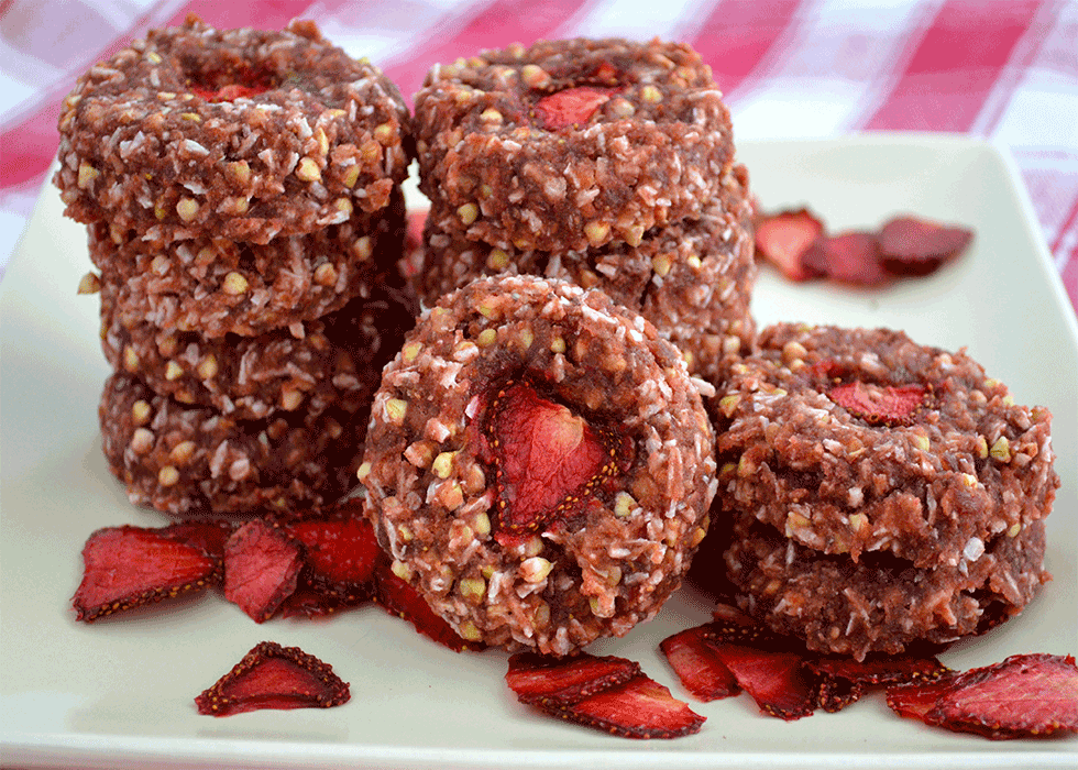 Ljubitelji presne hrane, vzemite papir in svinčnik! Brezglutenci, kupite vse sestavine! Vsi vi, ki ne prenašate laktozo ali jajca, pojdite pripravljat to okusno sladico! Vsi drugi ki imate rad sladko in zdravo, hitite se na okusne jagodne prigrizke - najboljšo presno alternativo klasičnega cheesecakea s sadjem.