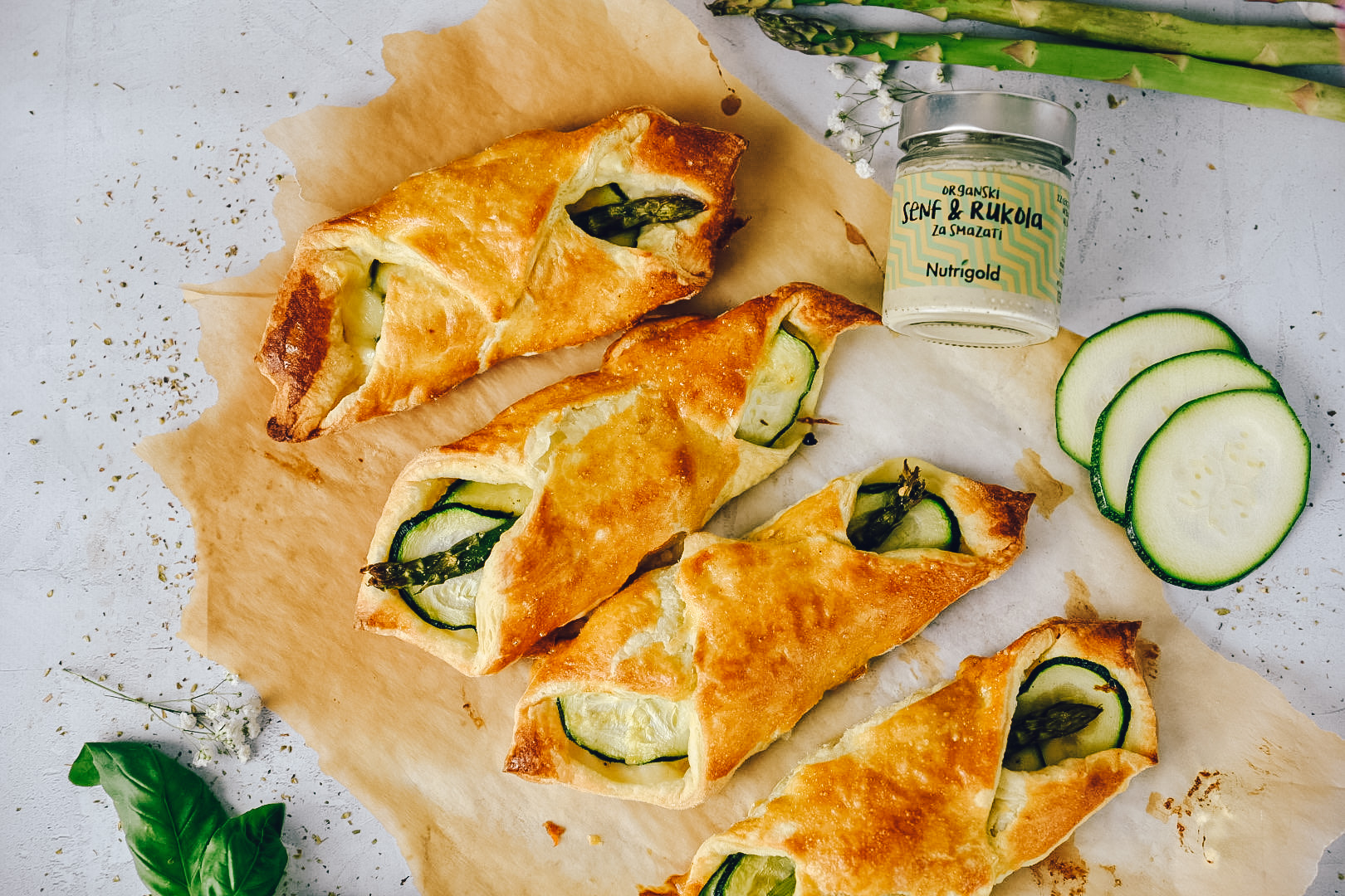Kremasta ricotta , neustavljivi šparglji, povrh tega pa še bogati Nutrigold namaz in gorčice n rukole. Ste že lačni? Čakajte, ima še! Vse to zvijte v hrustljavo listnato testo in uživanju ne bo konca!