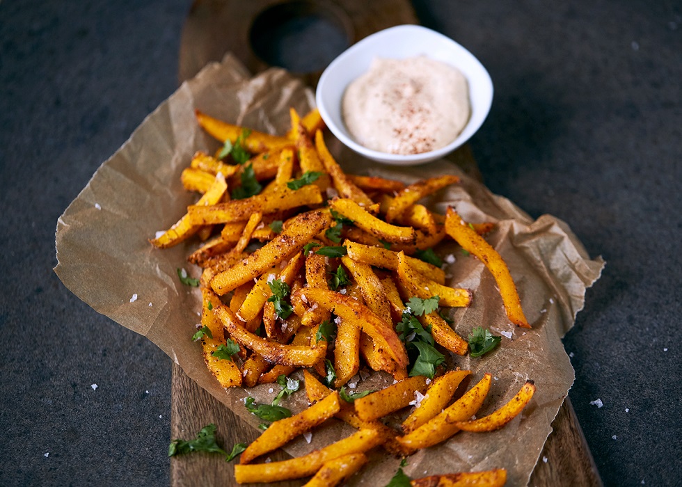 Malo bolj aromatičen in drugačen pomfrit bo vas navdušil in postal vaš najboljši obrok za večerjo. Tahini, popolna pasta iz sezama bo obogatila vsaki grižljaj, če pa ste oboževalec sezama, pred peko lahko potresete bučo s semeni.