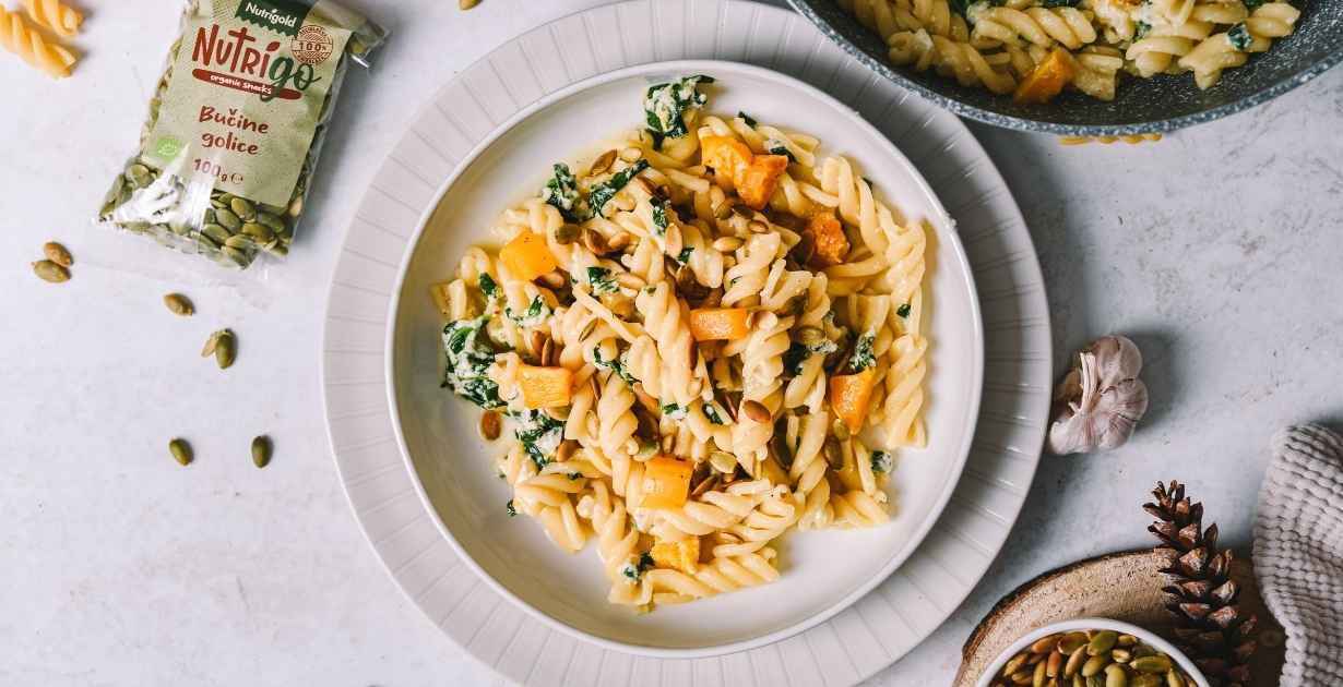 Jeseni se ta jed preobleče v pravo jesensko poslastico: buča prinaša tople oreščkove tone, sveža špinača pa daje lahkotnost, kremasta tekstura pa je še bolj privlačna zaradi hrustljavih bučnih semen. Komaj čakamo, da se prepustimo polnosti okusov, ki tako prijetno grejejo želodec v meglenih jesenskih popoldnevih!