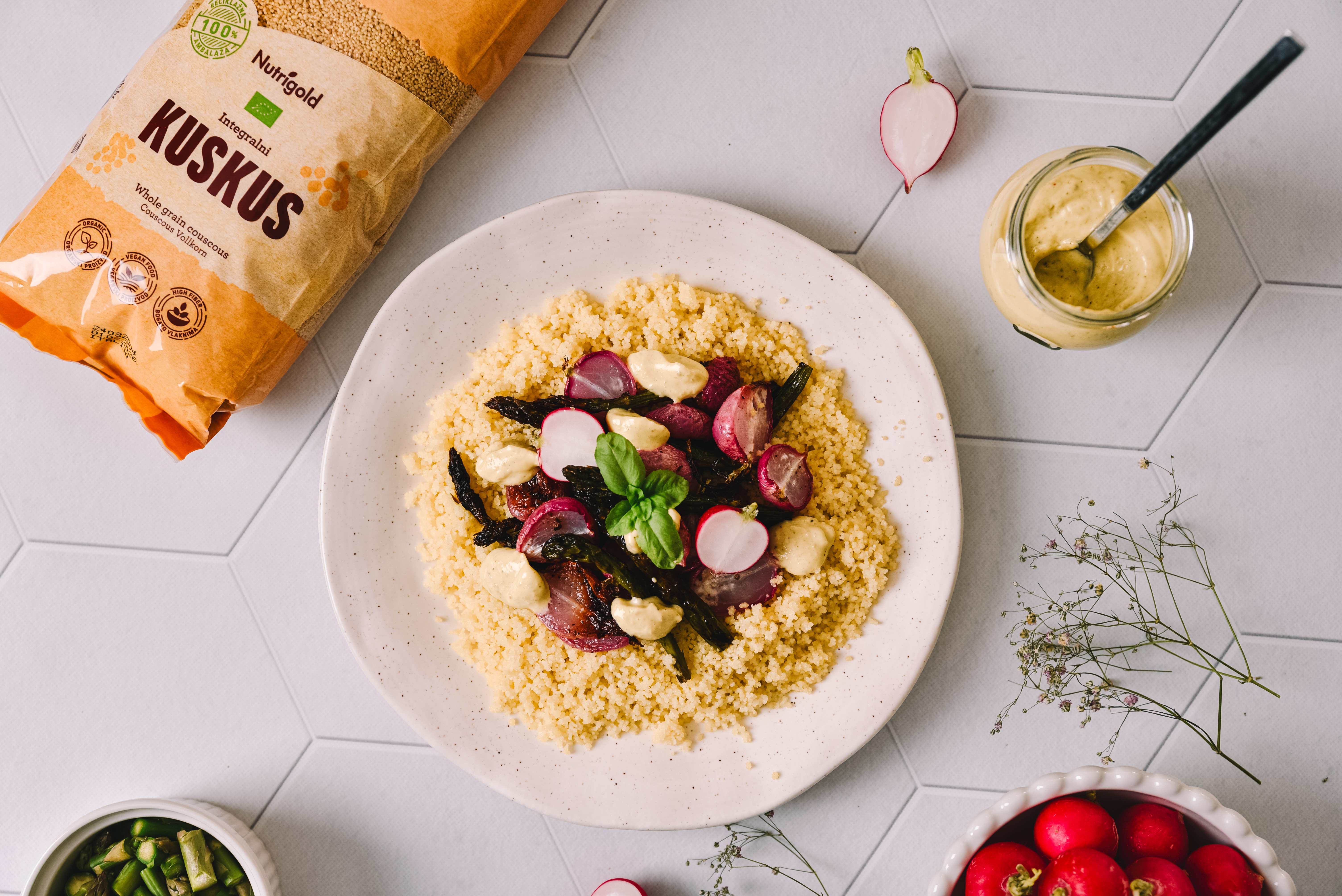Kuskus je lahki, se hitro pripravlja in je nevtralnega okusa, zaradi česa je odličen spremljevalec različnih vrst jedi. Je bogat z ogljikovimi hidrati in vlakninami ter vam zagotavlja občutek sitosti. Šparglji so že dobro znani v kulinaričnem svetu kot odličen vir vitaminov in mineralov, medtem ko so redkvice odličen vir vitamina C, kalija in vlaknin.