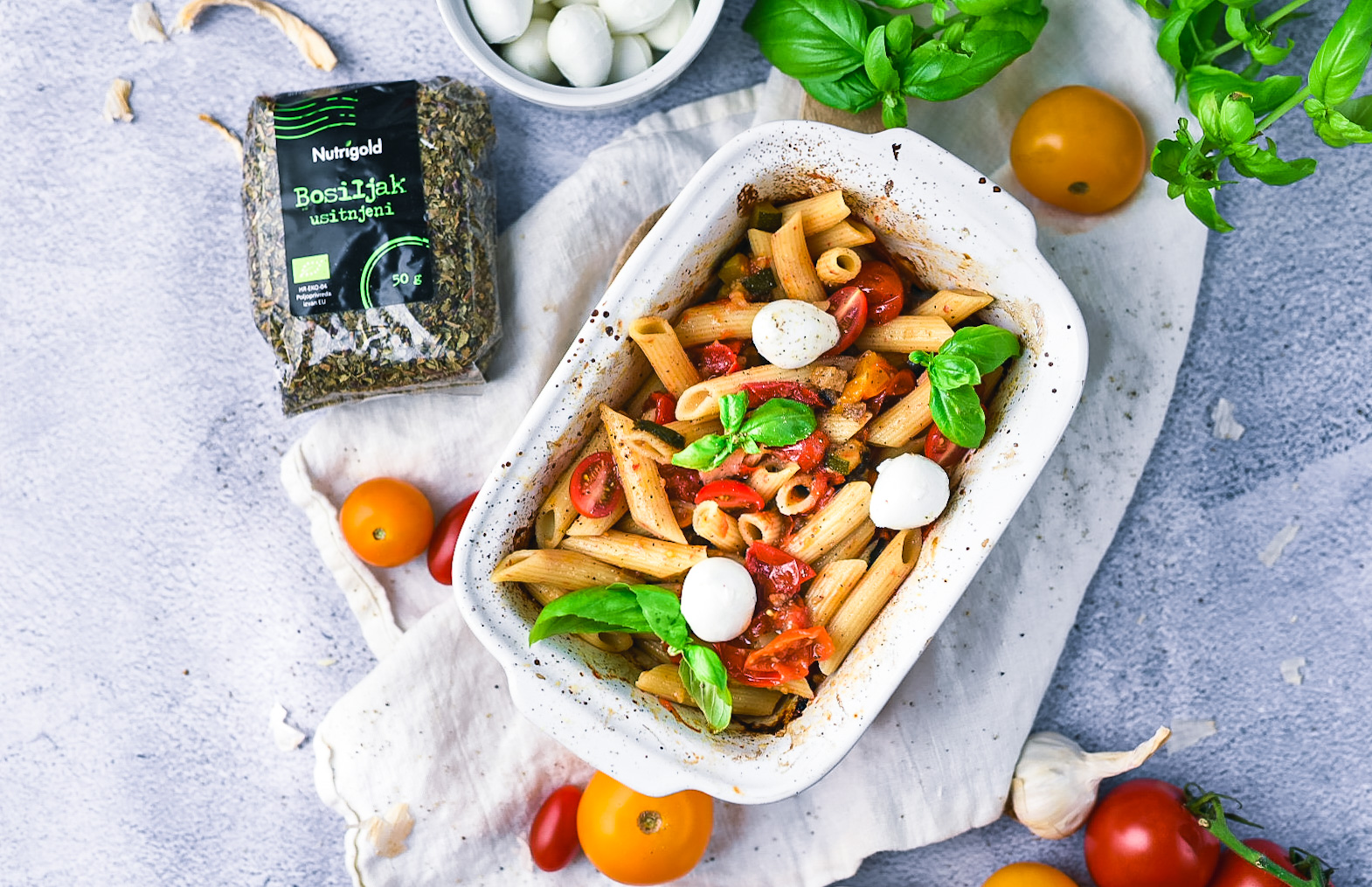 Zelenjavo sesekljajte, začinite in pecite v pečici 45 minut na 180°C, potem aromatično omako premešajte s kuhanimi testeninami, vse postrezite z dodatkom mocarele in listov sveže bazilike.