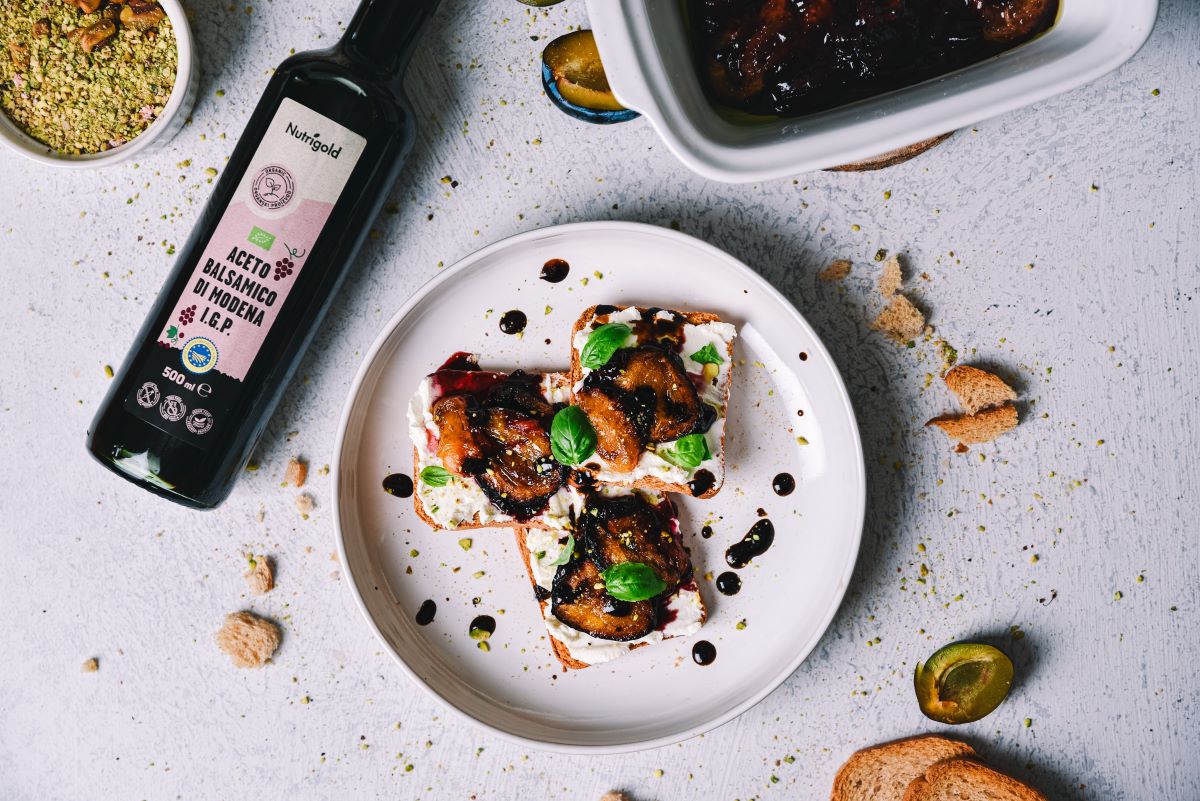 Ob prvem grižljaju najprej začutite hrustljavo teksturo odlično popečenega kruha, ki nato prepusti glavno vlogo kremasti mehkobi sira rikota. A prava zvezda te jedi so pečene slive, ki s svojo sočnostjo in rahlo karameliziranim okusom zaznamujejo vsak grižljaj. Balzamični kis še dodatno poudari naravno sladkobo sliv, oljčno olje pa daje prefinjen, bogat okus, ki vse sestavine poveže v harmonično celoto.