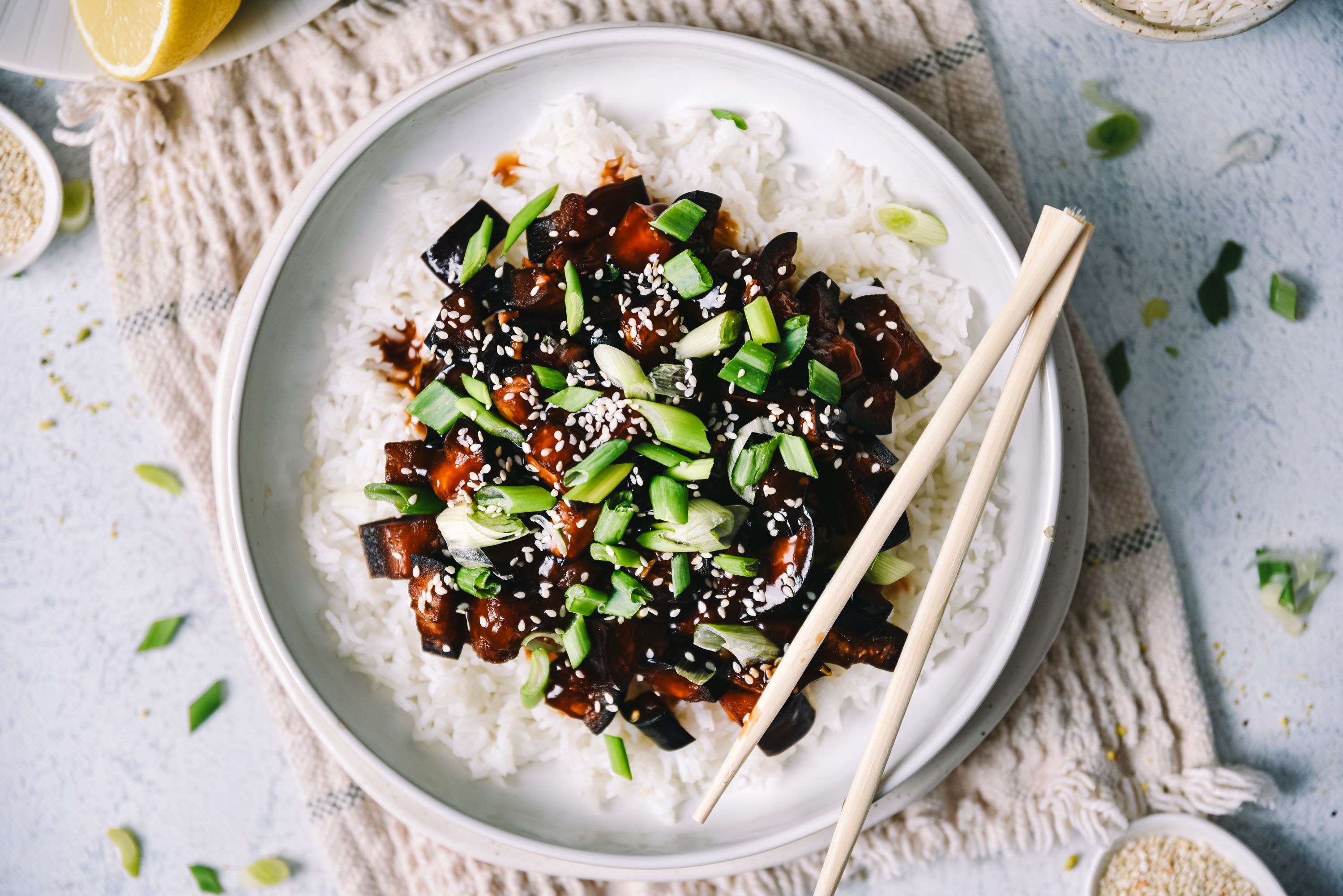 Pripravite se za neustavljiv, eksotičen obrok, ki bo oživel vašo kuhinjo - Teriyaki jajčevec z rižem.