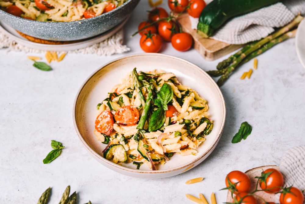 V naši različici smo se odločili, da testenine z bučkami in šparglji naznanijo pomlad in odprejo sezono pisanih jedi!