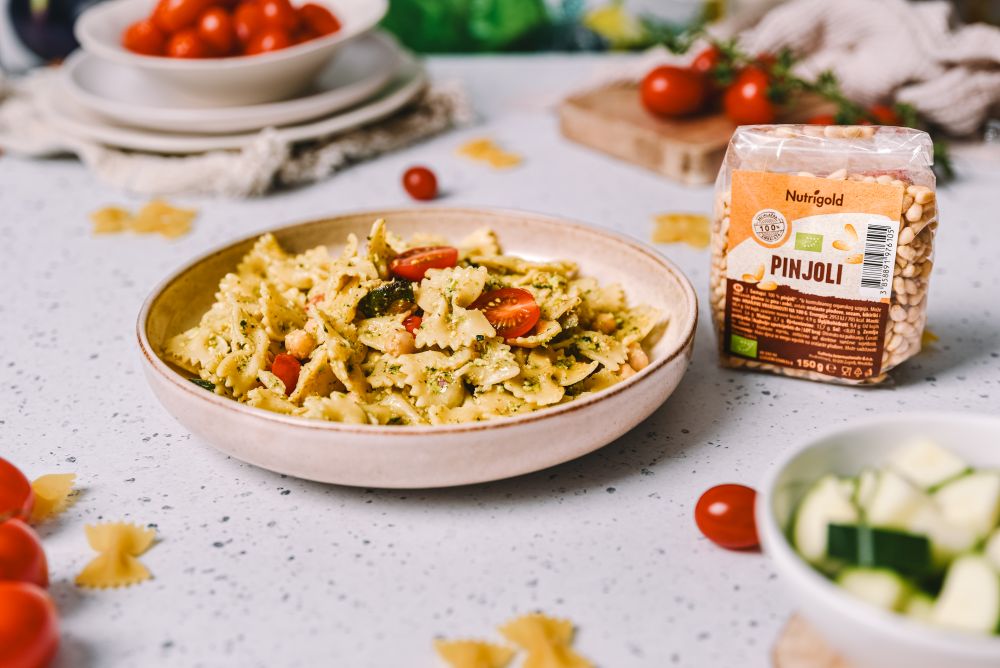 Rahlo popečeni pinjoli, dišeča bazilika in sočne bučke se spremenijo v neustavljiv pesto, ki se odlično poda k testenini farfalle.