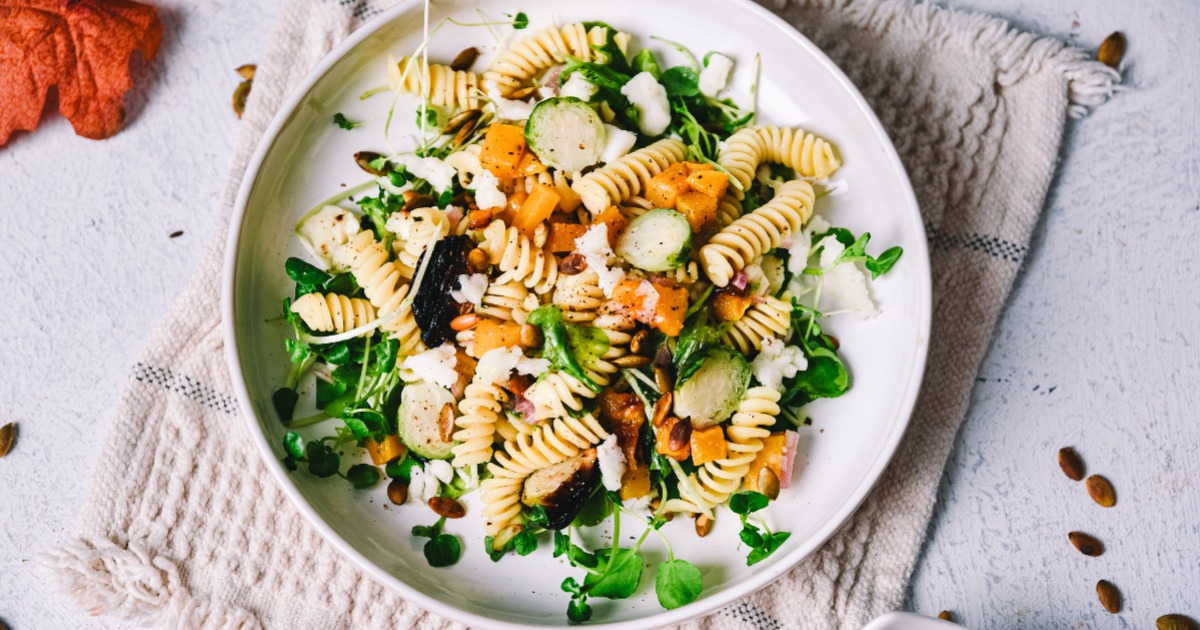 Uživajte v vonjavah in barvah jeseni s to kremasto in hrustljavo testeninsko solato, kot nalašč za tiste trenutke, ko potrebujete nekaj lahkega in hkrati nasitnega. Kombinacija pečene buče, brstičnega ohrovta in kozjega sira ustvari ravnovesje med sladkimi, slanimi in oreškastimi notami, tamari omaka in javorjev sirup v prelivu pa poskrbita za popoln kontrast. Pika na i so še bučna semena za prikupno hrustljavost solate.