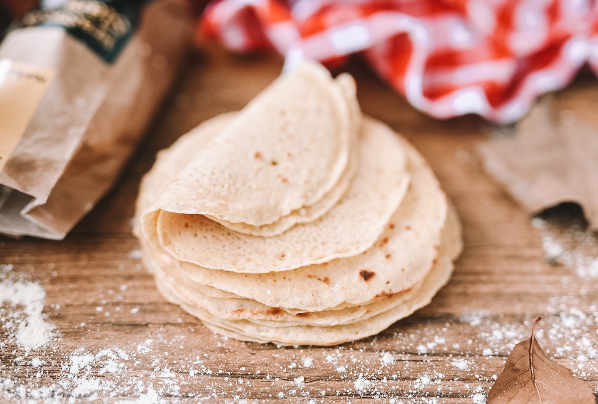 Tortilje, tenko hrustljavo testo ki izvira iz Mehike, se lahko naredijo s polnozrnato ali navadno belo moko.