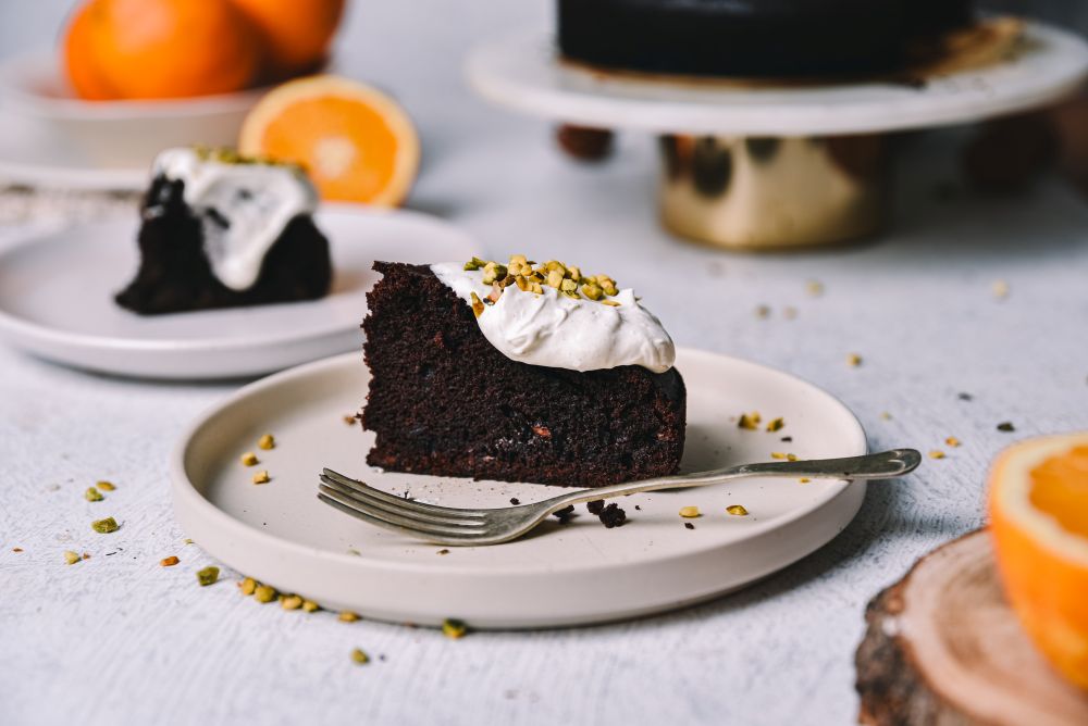 Bogat okus kakava se odlično ujema z osvežujočo aromo pomaranče, koščki čokolade pa vsaki rezini dodajo popoln vtis. Najboljši del? Postrežemo jo s stepeno sladko smetano obogateno s kardamomom, ki da tej torti pravi "gurmanski" pridih.