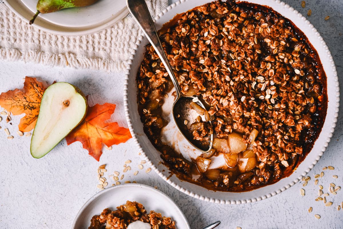 S prihodom jeseni se začne tudi sezona sočnih jesenskih sadežev. Hruške so še posebej slastne in popolne za ustvarjanje neverjetnih sladic. Ena izmed teh je Crumble s hruškami, ki tekne h kavi ali kot sladica po obroku.