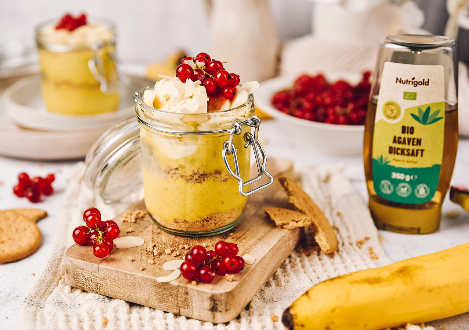 Banano zmečkajte v manjšem loncu in zmešajte z agavinim sirupom, preostankom mandljevega napitka, vanilijo in kurkumo ter kuhajte, dokler ne zavre.