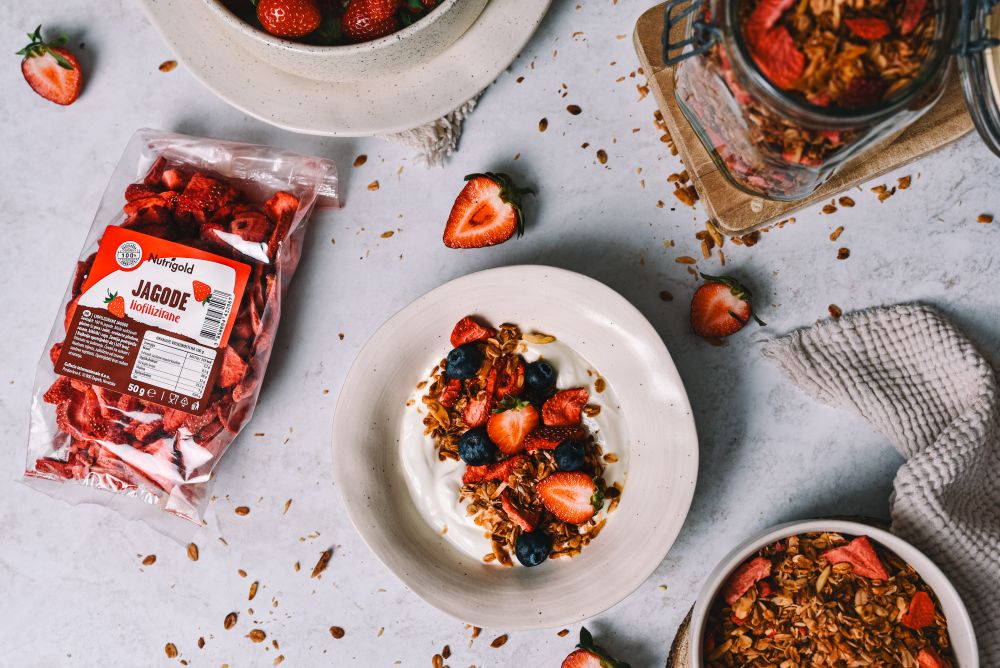 Ta domača granola združuje pražene ovsene kosmiče, hrustljave mandlje in neustavljivo aromo vanilje, obogateno z javorjevim sirupom in kokosovim oljem. Kokos prinaša tropsko noto, liofilizirane jagode pa dodajo sadno svežino in rahlo trpkost, ki odlično uravnovesi sladkobo.