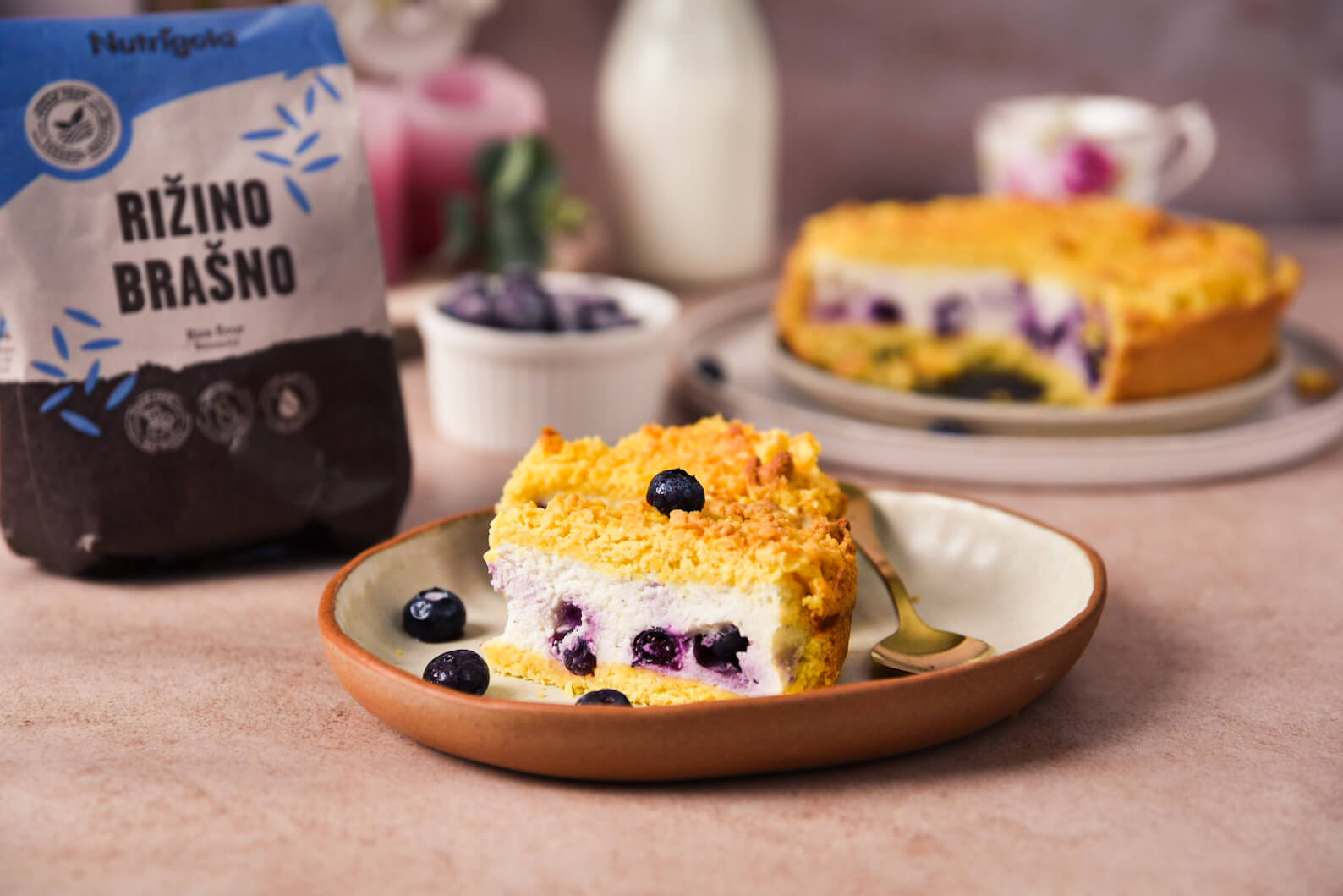 Testo smo izdelali iz odlične Nutrigold riževe moke, rumenjakov, tapioka škroba, masla, limone in trsnega sladkorja. Okusna krema iz grškega jogurta in borovnic se popolno ujela s krhkim testom.