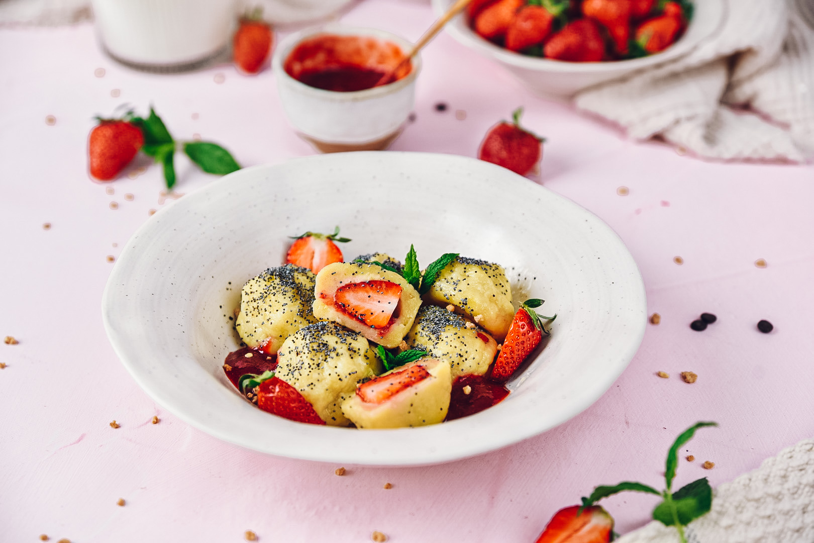 Testo pustite da stoji za pol ure v hladilniku, potem začnite s pripravo cmokov. Kuhajte jih v blago slani vodi, dokler ne splavajo na površino, postrežete jih lahko z dodatki po želji, mi smo se odločili za marmelado iz jagod in za sveže jagode.