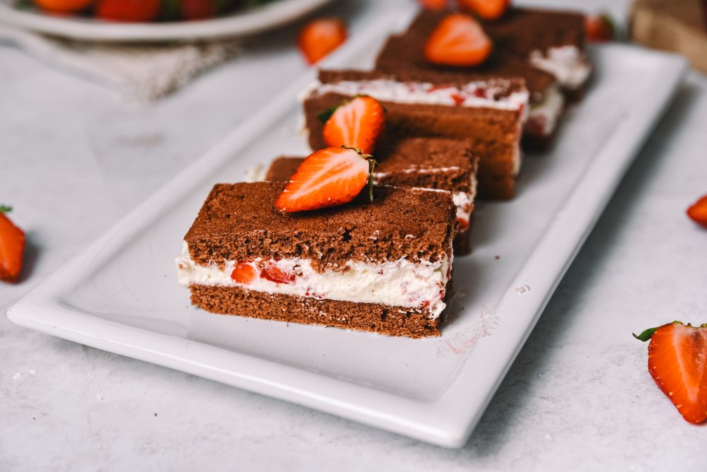 Ta kremasta poslastica odlično združuje rahel biskvit, bogato kremo in sočne jagode v neverjetno svežo in okusno sladico. Domača različica, ki jo je navdihnila znamenita nemška Milchschnitte, prinaša pridih pomladi z jagodami, ki se nežno vpijejo v kremo in ustvarijo pravi užitek v vsakem grižljaju.