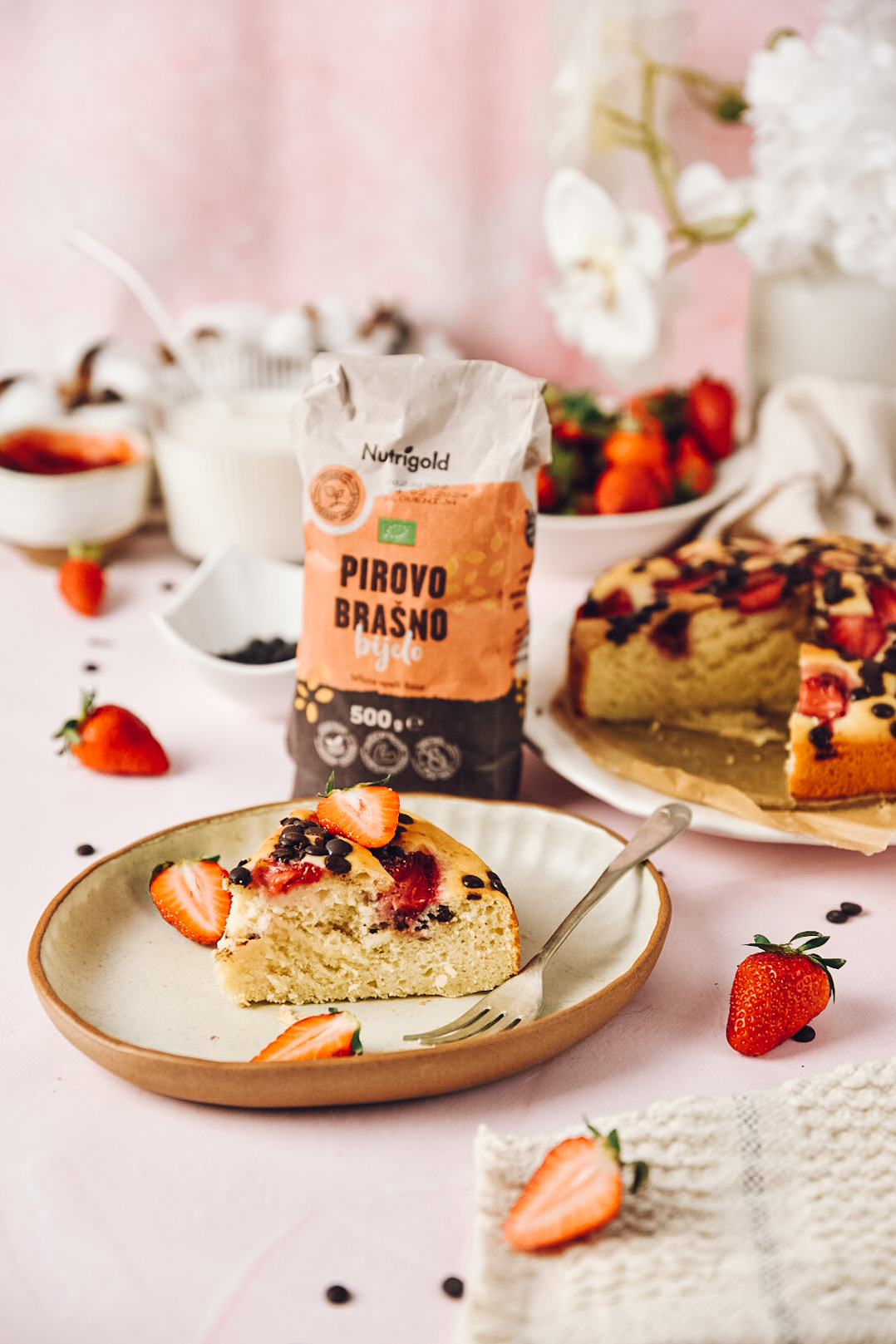Okusna sladica s sadjem iz zmesi za palačinke bo nastala in izginila v hipu! Za pripravo potrebujete le nekaj dosegljivih sestavin, eno skledo in stepeno metlico. Vse sestavine zmešajte s stepeno metlico, prestavite v model za peko, dodajte jagode in čokoladne koščke in voila - kolač je prirpavljen za peko!
