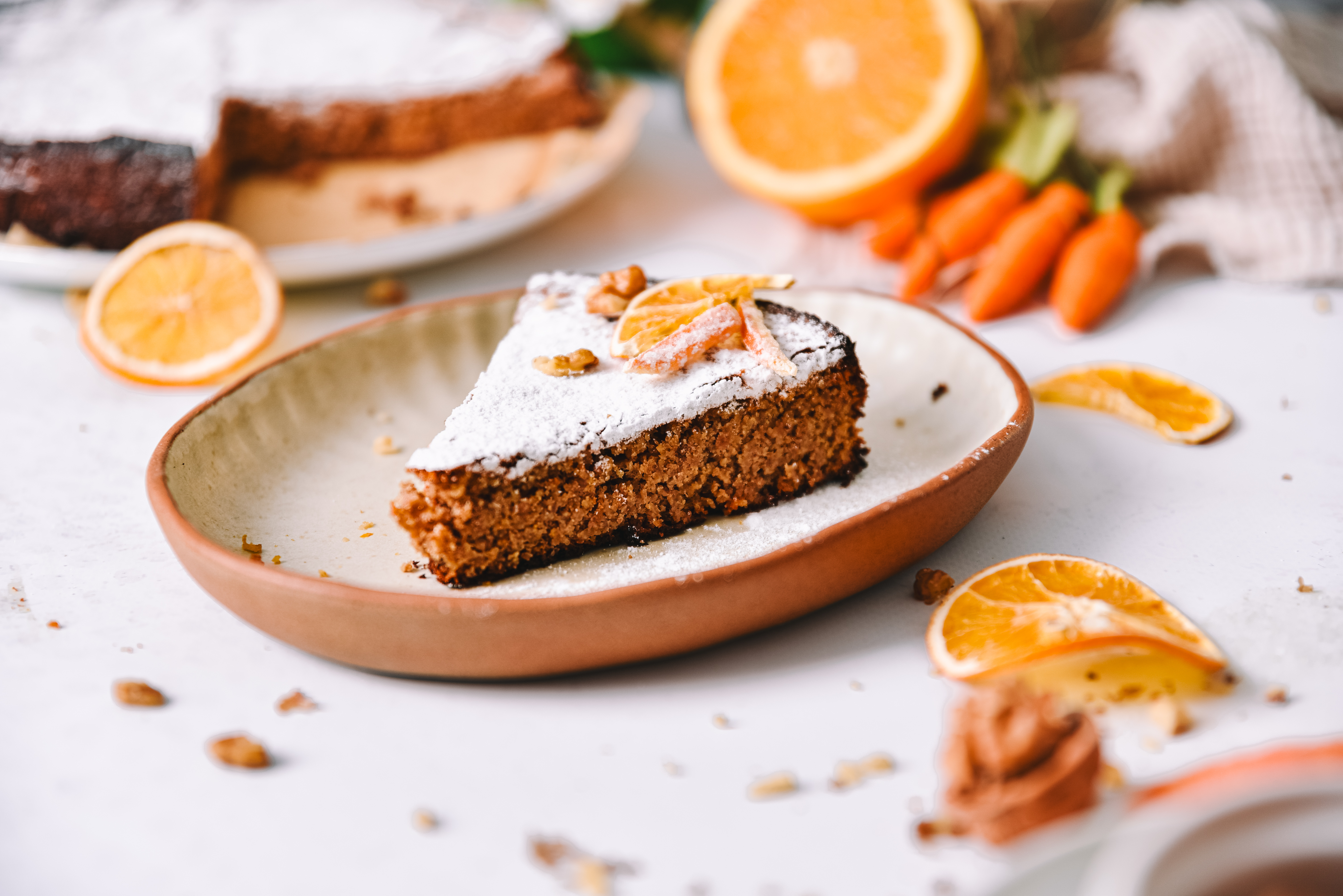 Ob prvem grižljaju boste začutili bogastvo teksture torte, ki je mehka, sočna in polna aromatičnih orehov. Vsak košček izžareva polnost okusa, medtem ko sočne note pomaranče dajejo prijeten kontrast.