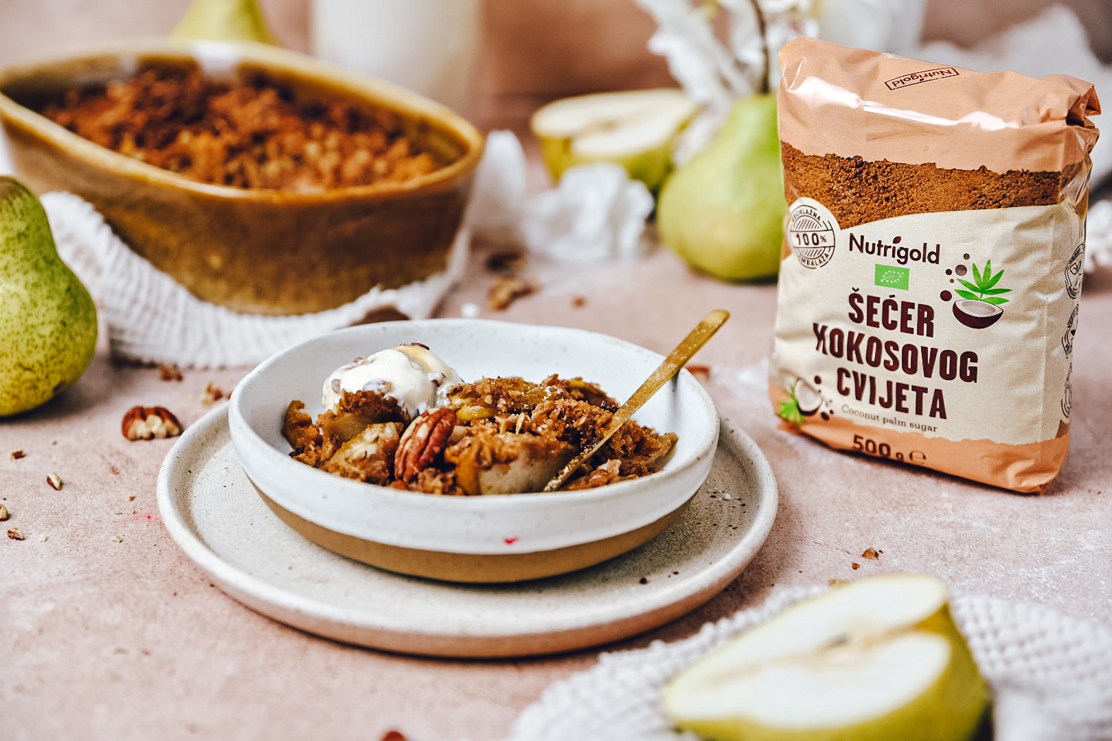 Ta čudovita sladica združuje sočne hruške s hrustljavim posipom, obogatenim z Nutrigoln sestavinami. Pripravite se za eksplozijo okusov, medtem kose sladke hruške ujemajo s toplimi začimbami in s hrustljavim slojem drobljenca. Ta je recept kot nalašč za pozdraviti september in da vam da neustavljivo sladico, ki jo boste želeli podelii z drugimi.