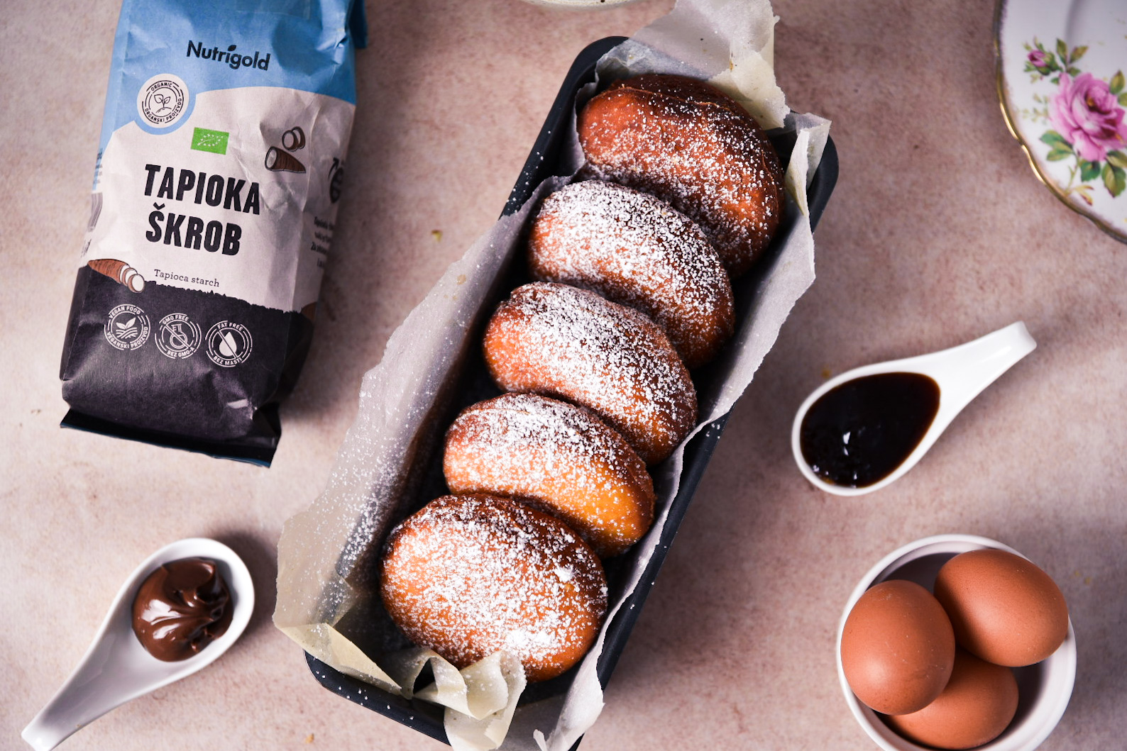 Testo smo posladkali z Nutrigold trsnim sladkorjem, za vonj in neustavljivo aromo pa so zaslužni rum in limonina lupinica. Rum se tradicionalno dodaja v testo, ker se verjame da ščiti krofe pred pretiranega kopičenja maščob.