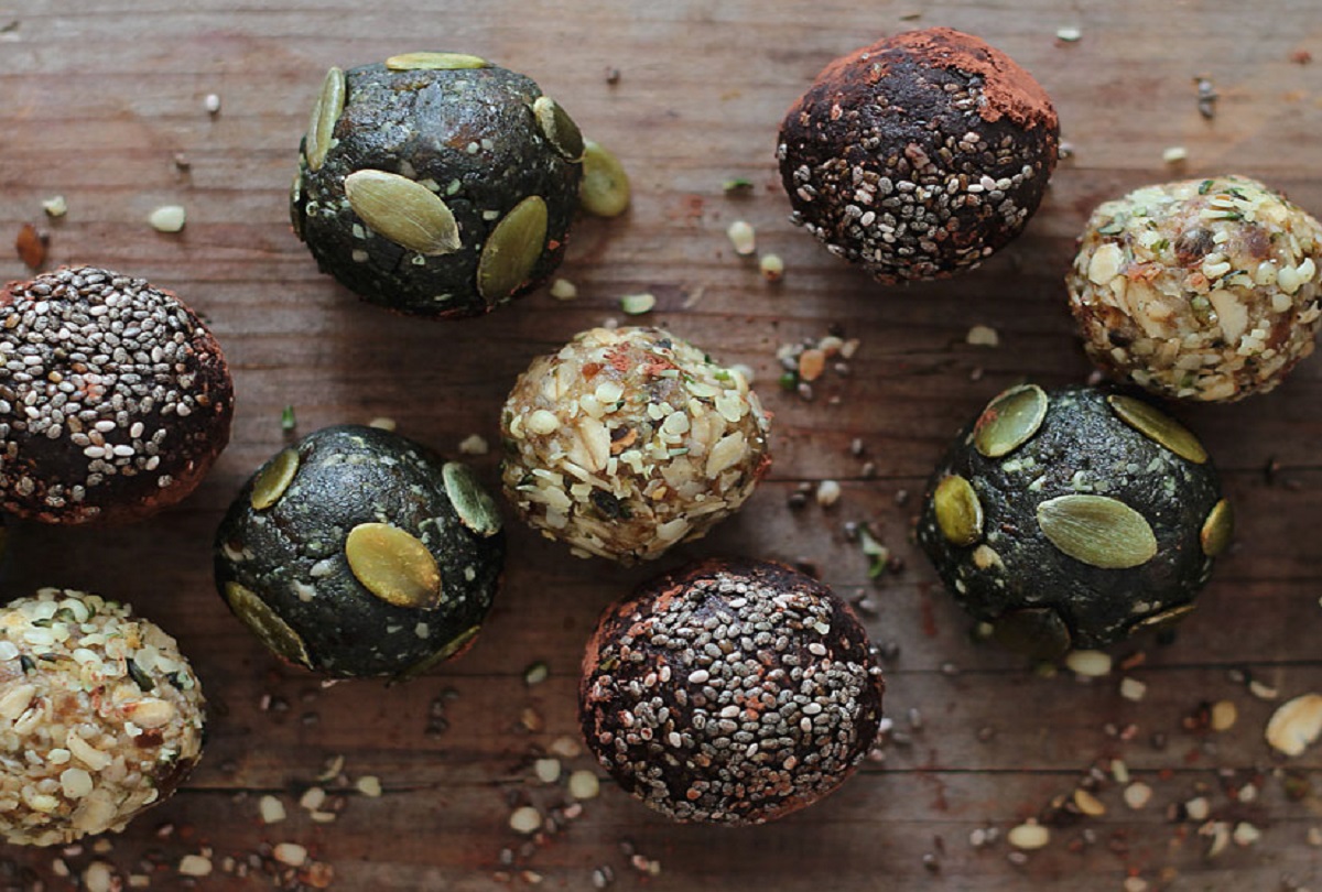 Osnova je ena in vsebuje datlje, chia semena, kakav prah ter nekaj kokosovega olja. Ta popolna kombinacija bo prenesla tudi druge, ne tako okusne sestavine, kot so spirulina, ingver v prahu, acai ali katerko koli superhrano, čigavega okusa ne marate.