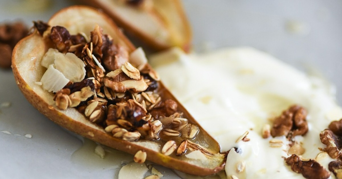 Hruške vam je ni treba polniti preden peke, temveč je dovolj, da jih postrežete z nekoliko jogurta in potresete s cimetom. Nadev iz ovsenih kosmičev, orehov, rozin in meda je tisto, zaradi česa je ta sladica prava specialiteta,