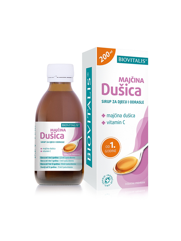 Sirup z materino dušico in z vitaminom C, za otroke od 1. leta in za odrasle ljudi, vsebuje izvleček materine dušice za dihali, in dodatek c vitamina pa je za krepitev odpornosti.