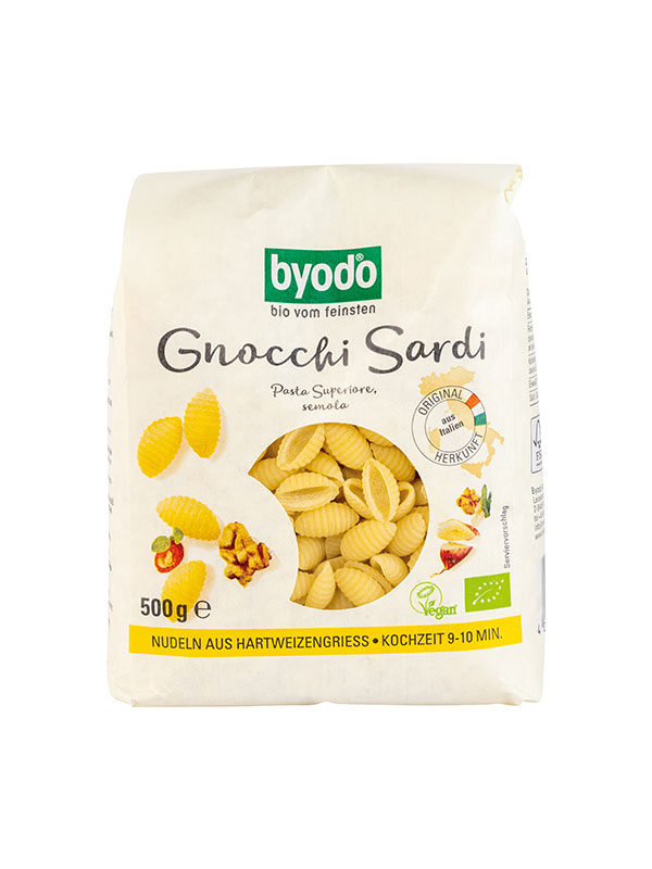 Byodo testenine so narejene iz skrbno izbrane durum pšenice iz ekološke pridelave po originalni italijanski recepturi v obliki gnocchia. Zaradi možnosti vezadnja in zadrževanja omake na celotni površini, se te testenine odlično ujemajo z gostimi in mestnimi omakami, in zarai simpatične oblike, jih bodo oboževali tudi vaši najmlajši!