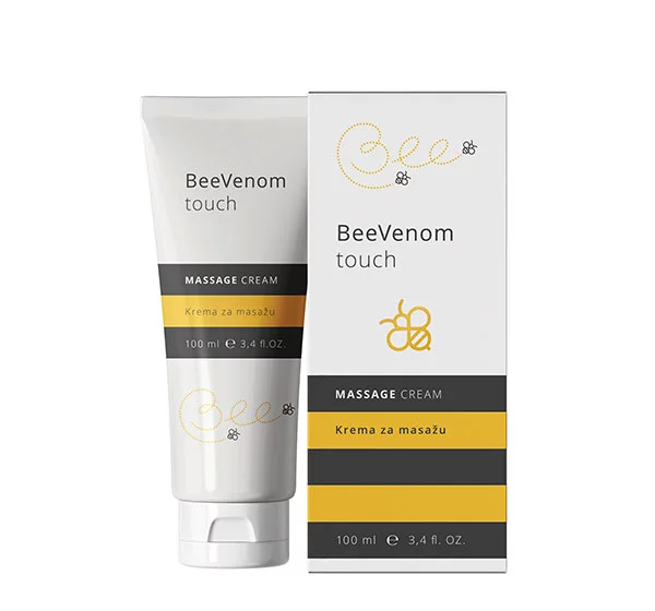 BeeVenom touch krema na osnovi naravnih sestavin in čebeljega strupa je namenjena olajšanju in masaži sklepih in mišic pri težavah, ki jih povzročijo športne poškodbe, raztegnjene kite ali delo za računalnikom.