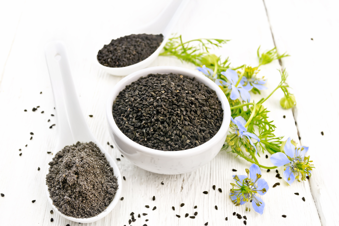 Semena črne kumine vsebujejo več od 00 kemijskih substanc, ki izboljšajo dobro zdravje. Semena črne kumine vsebujejo več vitaminov B1, vitamin B3, folno kislino, kalcij, železo, baker, cink, fosfor in mnoge druge minerale in vitamine. Zaradi visoke vsebnosti esencialnih omega-3 maščobnih kislin semena črne kumine zmanjšajo raven slabega holesterola in pomagajo pri nadzoru visokega krvnega tlaka.