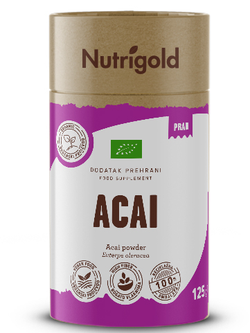 Acai v prahu je izdelek, ki je pridobljen z mletjem suhih acai jagod, majhnih vijoličnih jagod, ki rastejo na acai palmah v Južni in Srednji Ameriki. To superživilo je postalo priljubljeno zaradi številnih prednosti in sposobnosti podpreti dobro počutje in dvigniti energijo. Pomaga pri razstrupljanju telesa, krepitvi imunskega sistema in izboljšanju energije. Acai prah je bogat z esencialnimi maščobnimi kislinami in vlakninami, kar prispeva k dolgotrajnemu občutku sitosti in stabilizira raven energije. Bogat je z antioksidanti, kot so antocianini, ki ščitijo telo pred oksidativnim stresom. Acai jagode vsebujejo fitohranila, ki lahko izboljšajo cirkulacijo krvi, kar prispeva k boljši oskrbi tkiv in organov s kisikom in hranili. S svojim odličnim okusom se poda k vsem pijačam, odličen pa je tudi v številnih sladicah.